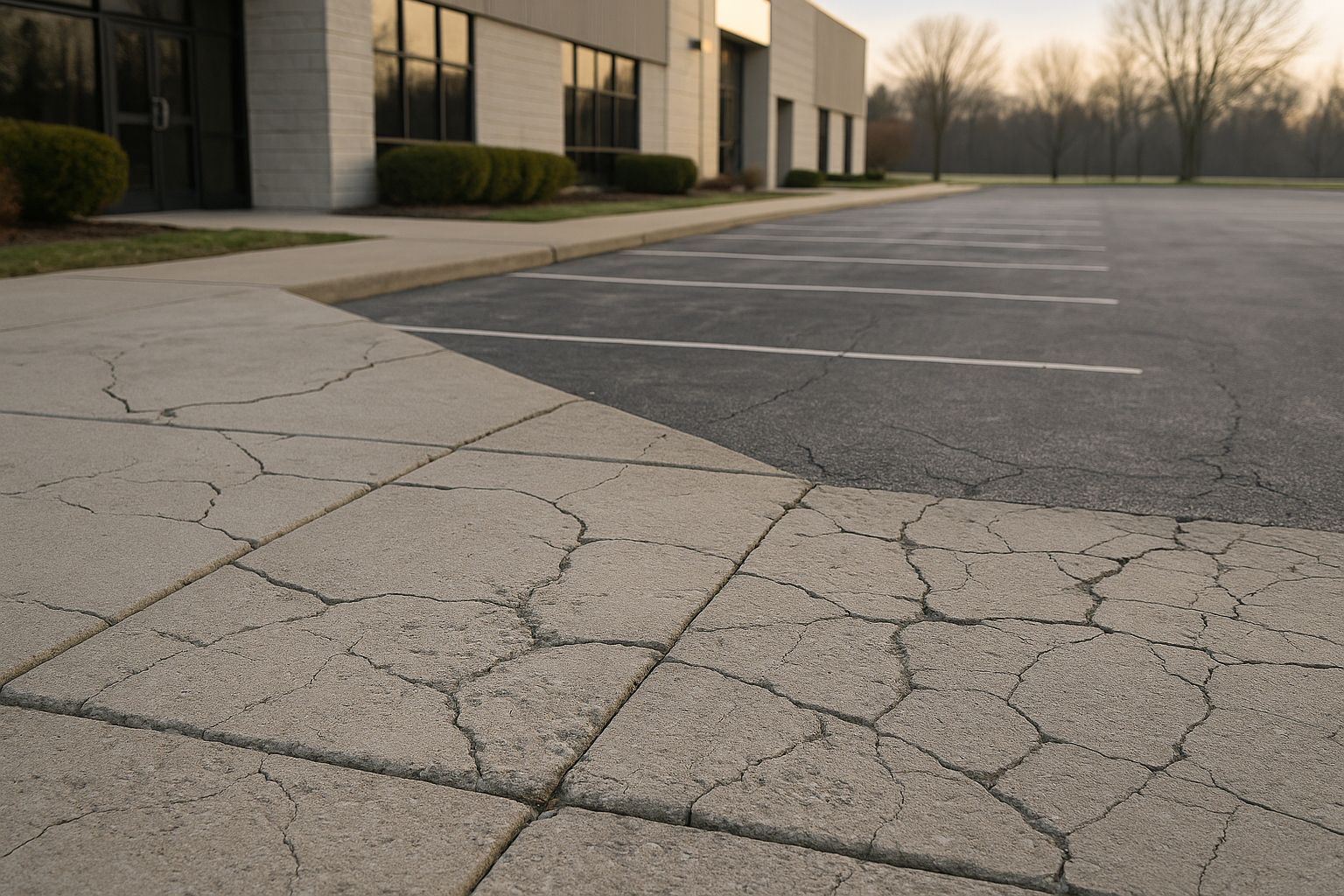 Safety-related surfaces come first. Sidewalks and pedestrian walkways with raised edges, heaved sections, or cracks wider than a quarter inch should be addressed as soon as temperatures allow. These directly affect pedestrian safety and carry the highest liability exposure.
